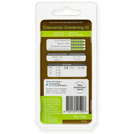 Crescendo Gardening 25 utilise des filtres antibruit de Dynamic Ear Company, qui offrent un passage d’air ouvert vers l’oreille, minimisant ainsi l’effet d’occlusion tout en maintenant l’oreille ventilée pour un confort optimal et une irritation réduite. Les bouchons d’oreille et les filtres acoustiques Crescendo Gardening sont entièrement lavables, ce qui assure une protection parfaite à tout moment.