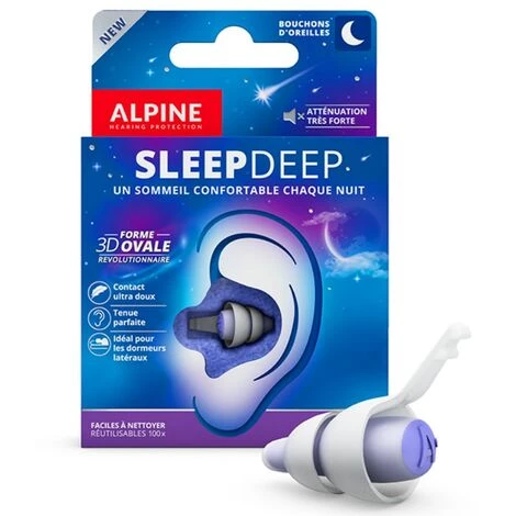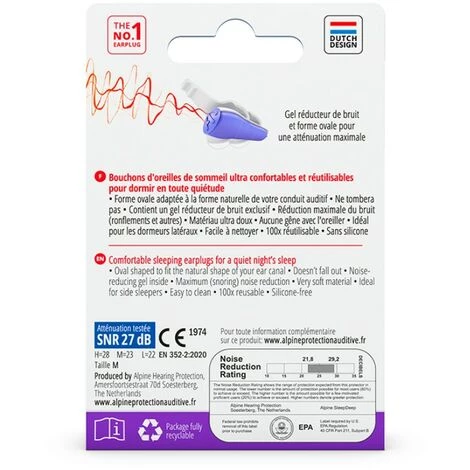Les bouchons d’oreilles SleepDeep offrent une atténuation moyenne (SNR) de 27 dB. Les bruits gênants seront étouffés, grâce à ces bouchons d’oreille qui facilitent l’endormissement et évitent de se réveiller facilement. Ces bouchons d’oreilles innovants sont fabriqués en Europe avec un matériau thermoplastique spécialement conçu : l’AlpineThermoShape. Grâce à ce matériau, les bouchons d’oreille prennent la forme de votre conduit auditif, s’adaptent parfaitement et restent en place toute la nuit. L’AlpineThermoShape est hypoallergénique, ne contient pas de silicone et ne provoque donc pas de réactions allergiques ni de démangeaisons irritantes. De plus, SleepDeep contient un gel de réduction du bruit Alpine qui offre une atténuation maximale.