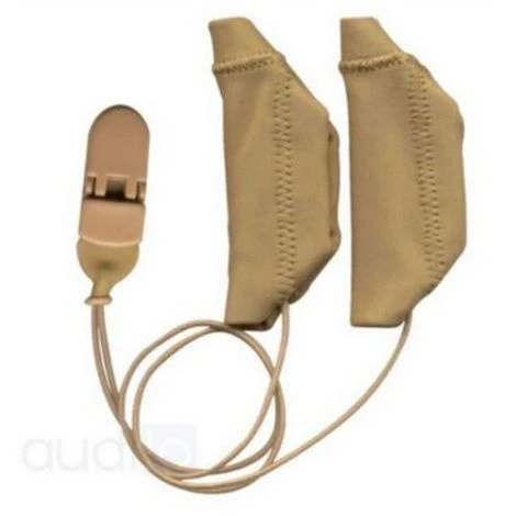 Housse pour un appareil auditif permettant un maintien sur le col grâce à un clip de sécurité.