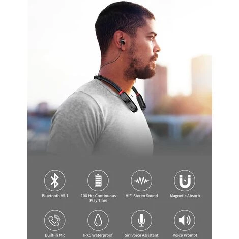 PORT ET UTILISATION CONFORTABLE : Les écouteurs Bluetooth tour de cou ont un tour de cou en silicone léger et sont livrés avec trois tailles de capuchons pour assurer un ajustement parfaitement confortable. Les oreillettes magnétiques garantissent une commodité sans enchevêtrement lorsque les écouteurs ne sont pas utilisés. De plus, un boîtier étanche IPX5 pourrait protéger vos écouteurs sans fil contre la sueur, la pluie, l’eau et plus encore.