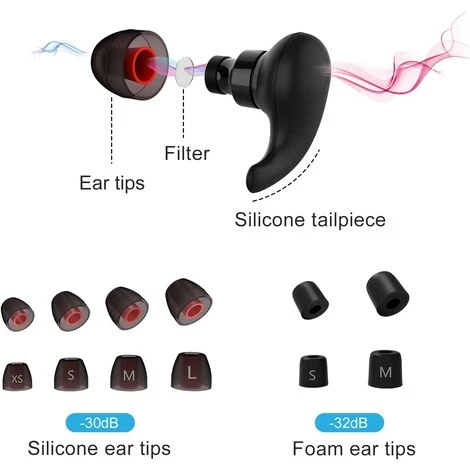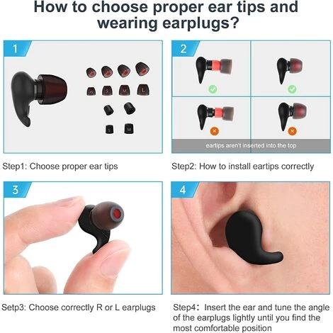 5.Les bouchons d’oreille sont livrés avec 4 paires d’embouts en silicone XS/S/M/L et 2 paires d’embouts en mousse à mémoire de forme, s’adaptent à la plupart des personnes à porter et à remplacer.