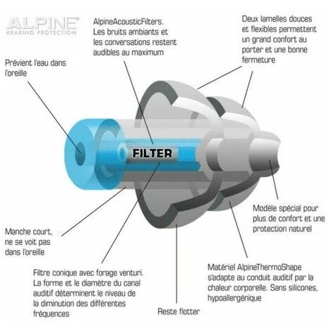 Les protections auditives Alpine sont équipées de filtres d’atténuation, spécifiques à chaque activité, permettant de protéger sans isoler complètement. Celles-ci vous procurent une protection optimale avec le plus grand confort.