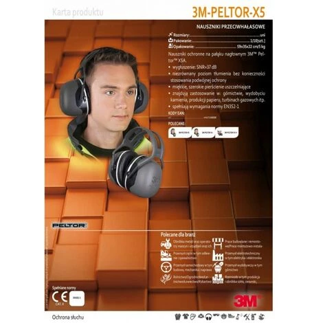 Protections auditives Cache-oreilles Silencieux Peltor-X5_x000D_Coussinets sur le bandeau 3M ™ Peltor ™ X5A._x000D_insonorisation: SNR = 37 dB_x000D_un niveau d’atténuation inégalé sans besoin de double protection_x000D_bagues d’étanchéité souples et larges_x000D_sont utilisés dans: l’exploitation minière, l’extraction de la pierre, la production de papier, les turbines à gaz, etc._x000D_répondre aux exigences de la norme EN352-1_x000D_Normes_x000D_EN352-1_x000D_Le produit est recommandé pour les industries_x000D_Métallurgie et opérateurs de machines et d’appareils et leur réparation_x000D_Travaux de construction et de rénovation / Travaux de montage et d’installation / Construction de routes_x000D_Industrie lourde, y compris les fonderies et le soudage_x000D_L’industrie électrotechnique, y compris l’électricité et l’électronique, et l’énergie_x000D_Industrie automobile, y compris la construction, la mécanique et la réparation de véhicules et le vernissage_x000D_Industrie extractive, y compris l’exploitation minière_x000D_Agriculture / Horticulture / Foresterie / Łowiectwo / Pêche_x000D_Artisanat y compris pro