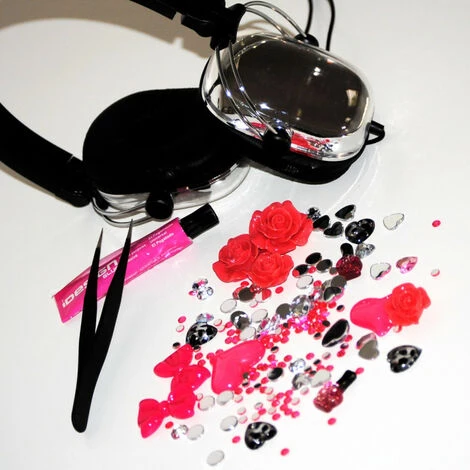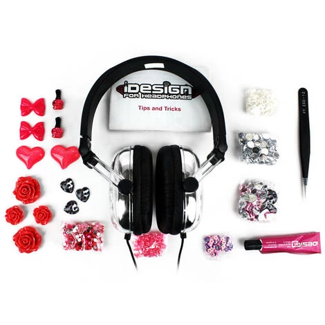 contient : un casque audio, une pince, de la colle, deux coques transparentes et de nombreux éléments de décoration (fleurs, cœurs…).