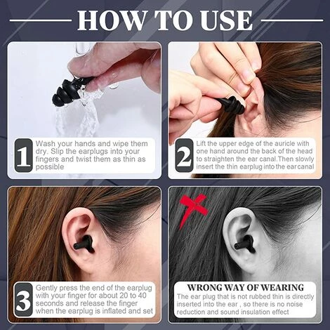 Facile utiliser: Glissez les bouchons d’oreilles dans vos doigts et tordez-les aussi finement que possible Soulevez le bord suprieur de l’oreillette avec une main autour de l’arrire de la tte pour redresser le conduit auditif Insrez ensuite lentement le bouchon d’oreille fin dans le conduit auditif Appuyez doucement sur l’extrmit du bouchon d’oreille avec votre doigt pendant environ 20 40 secondes et relchez le doigt lorsque le bouchon d’oreille est gonfl et rgl .